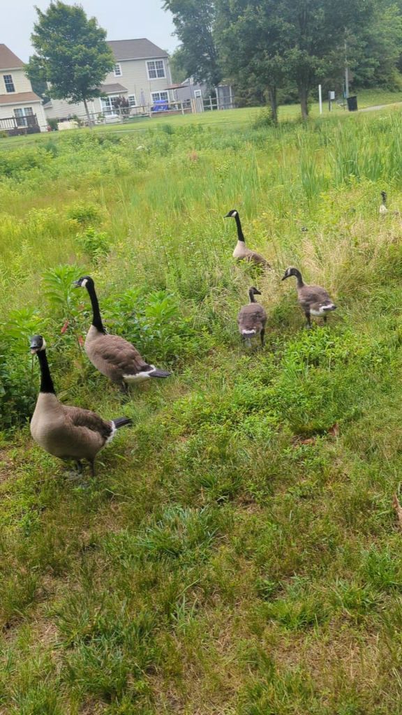 One family stayed especially close, moving gently along the path beside me. The others were nearby, grazing quietly or heading down the small hill near the stream. In all, there were at least 14 geese and goslings scattered peacefully across that part of the trail.